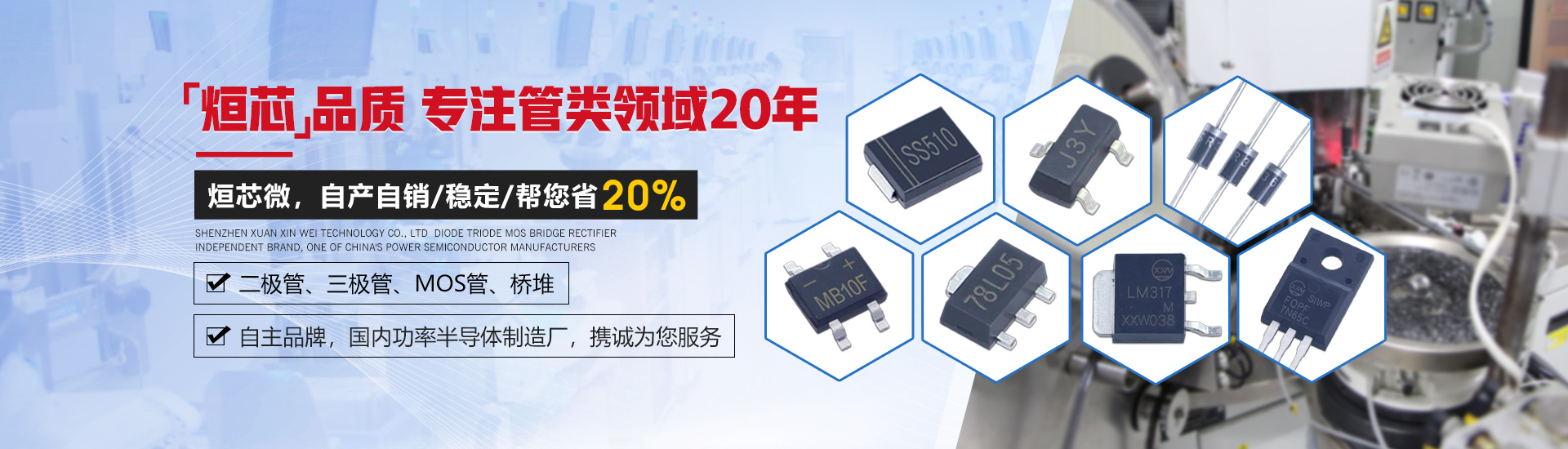 深圳市烜芯微科技有限公司是一家集研發(fā)、生產(chǎn)、銷售于一體,專注于二極管、三極管,MOS管、橋堆等功率半導體領域發(fā)展的企業(yè)。采用國際領先的GPP芯片生產(chǎn)工藝及一心多Die高精密制造工藝,擁有功率半導體器件工程實驗室,全自動高精密生產(chǎn)設備,產(chǎn)品層層把控,全程可追溯,保障了每只產(chǎn)品的卓越品質(zhì)。 產(chǎn)品封裝包括SMA,SMAF,SMB,SMBF,SMC,SOD-123,SOD-123FL,SOD-323,SOD-323FL,SOD-523,SOD-723,SOT-23,SOT-89,SOT23-3L,SOT23-5L,SOT23-6L,SOT-223,SOT-523,SOT-723,DO-41,DO-15,DO-27,DO-35,R-1,R-6,LL-34,LL-41,TO-277,TO-92,TO-92S,TO-92L,TO-126,TO-251,TO-252,TO-262,TO-263,TO-220,TO-220F,TO-247,TO-3P,TO-264,MBS,MBF,MBM,ABS,UMB,UMSB,DB,DBS,D3K,KBP,GBP,GBU,GBL,GBJ,KBL,KBU,KBJ,KBPC,KBPC6,KBPC8,KBPC-W,DNF,TSSOP-8,TSSOP-16,SOP-4,SOP-6,SOP-8,SOP-10,SOP-14,SOP-16,DIP-4,DIP-6,DIP-8,DIP-10,DIP-14,DIP-16,月產(chǎn)各封裝達6億只。 公司通過了ISO14001環(huán)境管理體系認證,產(chǎn)品均獲得了ISO9001質(zhì)量體系認證、UL、SGS等認證,符合歐盟最新RoHs指令。擁有和致力于烜芯微/XXW自主品牌產(chǎn)品的推廣,提供技術支持,選型替換,cost down方案及擁有專業(yè)的生產(chǎn)管理團隊和銷售團隊,保證了供貨穩(wěn)定及售前選型服務等問題。 公司產(chǎn)品廣泛應用于開關電源、適配器、逆變器、控制器、汽車電子、家用電器、通訊設備、無線充、鋰電池保護板、驅動電機、安防警報、太陽能光伏產(chǎn)業(yè)等多個領域。取得了國內(nèi)外眾多品牌大廠的認可與合作,我們將堅持奉行“烜芯品質(zhì),誠信經(jīng)營,合作共贏”為公司經(jīng)營理念!竭誠為新老客戶提供優(yōu)質(zhì)的產(chǎn)品及服務。